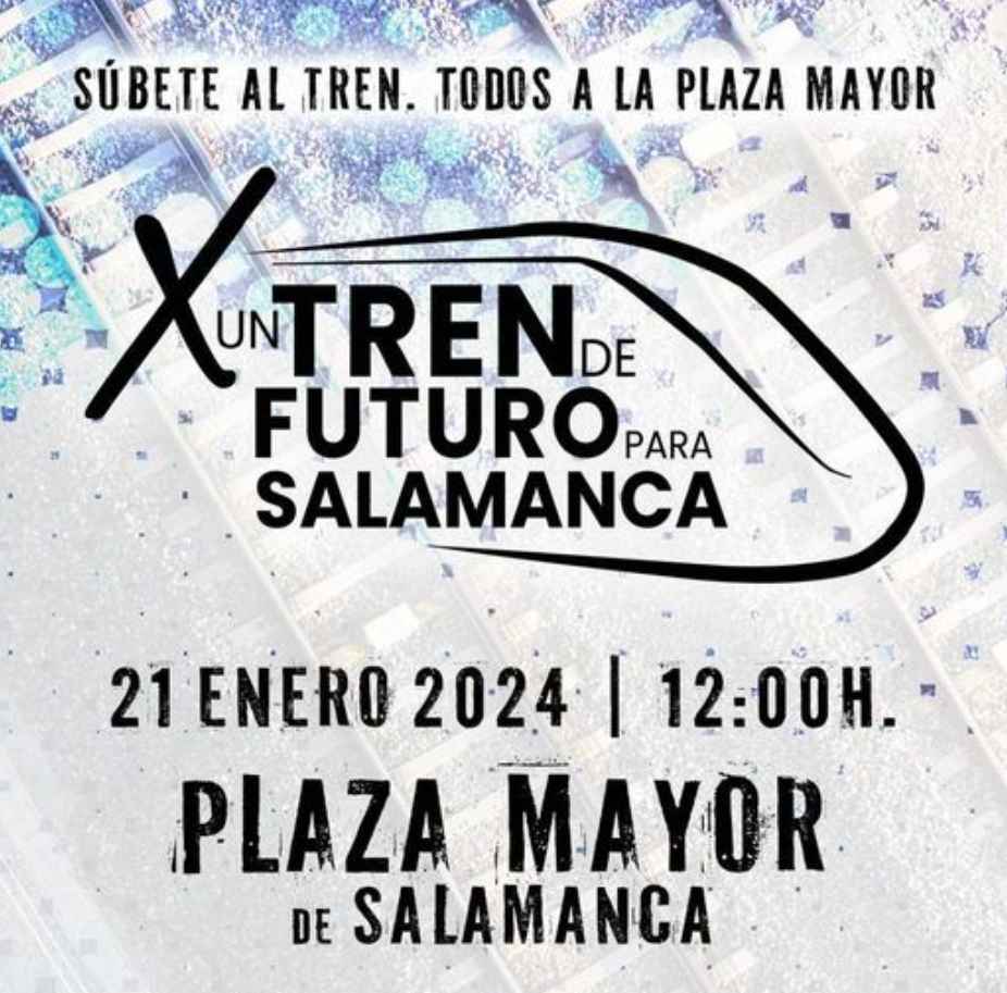 POR UN TREN DE FUTURO PARA SALAMANCA Salamanca mantiene la manifestación y anima a los ciudadanos a acudir a la Plaza Mayor el domingo 21 ‘Por un tren de futuro para Salamanca’ + Añadir Google Calendar + exportación iCal / Outlook Fecha 21 Ene 2024 ¡Caducado! Hora 00:00 - 13:00 Compartir este evento