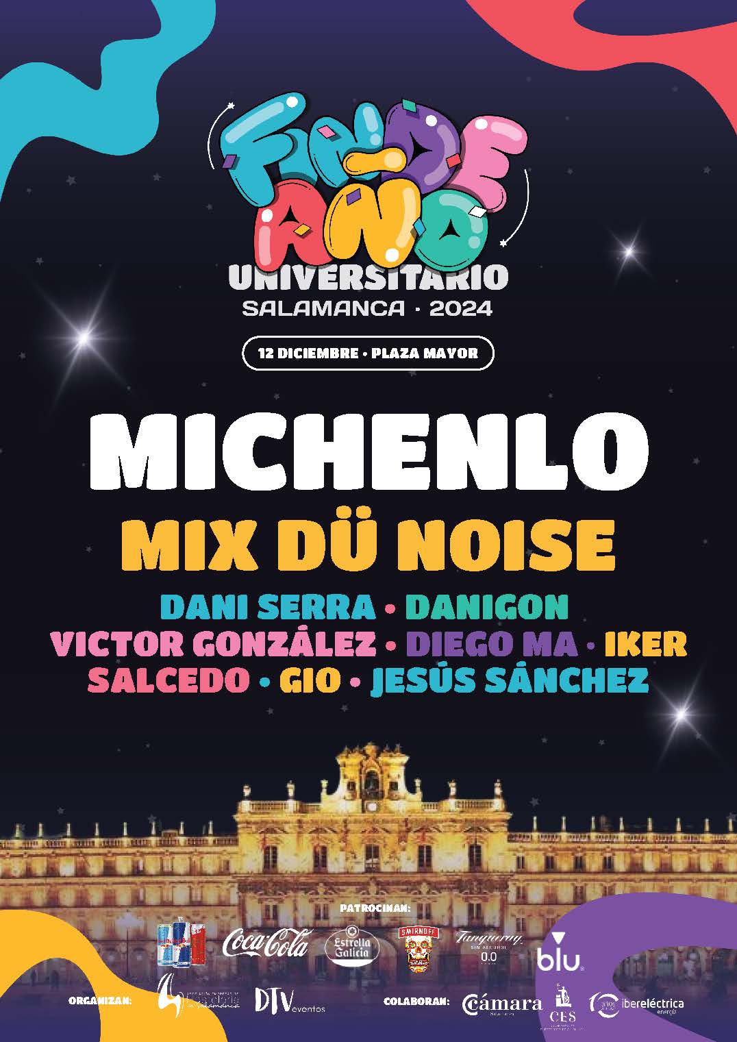 En 2024, Fin de Año Universitario será posible gracias al patrocinio de Red Bull, Cocacola, Estrella Galicia, Smirnoft Tanqueray 0,0, y Blu, así como la colaboración del Ayuntamiento de Salamanca, Cámara de Comercio, CES e Ibereléctrica energía.
