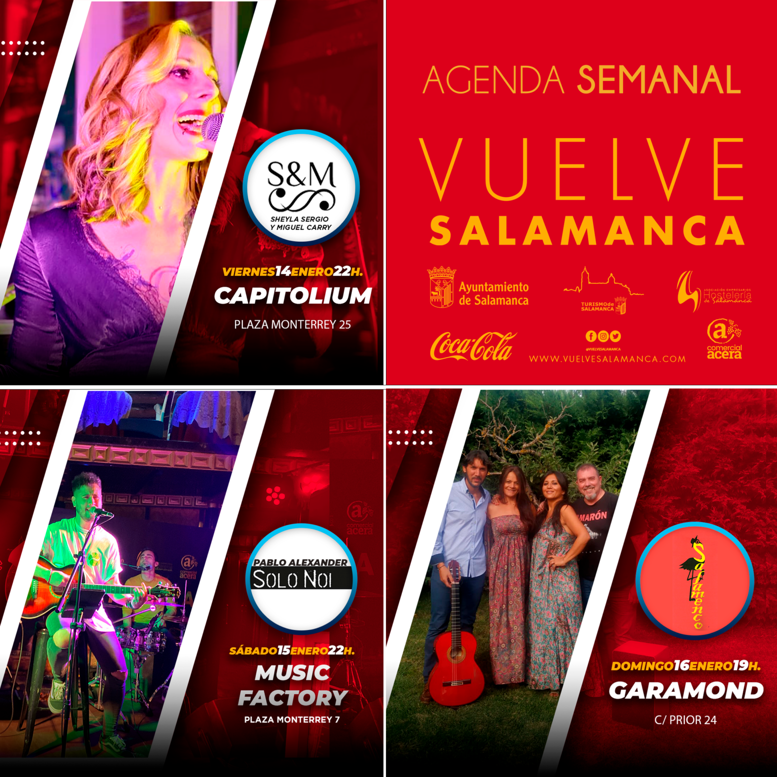 El Ayuntamiento de Salamanca, a través de la concejalía de Turismo, la Asociación de Empresarios de Hostelería, Coca Cola y Comercial Acera, impulsan tres nuevos eventos que apuestan por la variedad de estilos musicales y la calidad, dentro del ciclo de conciertos que, bajo la denominación ‘Vuelve Salamanca’, impulsa las actuaciones de música en vivo como un activo que fomente la recuperación del sector del ocio nocturno.