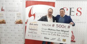 El cheque con valor de 500 euros, patrocinado por el grupo Mahou-San Miguel, por el presidente de la Asociación de Empresarios de Hostelería de Salamanca, D. Jorge Carlos Moro Corredera.
