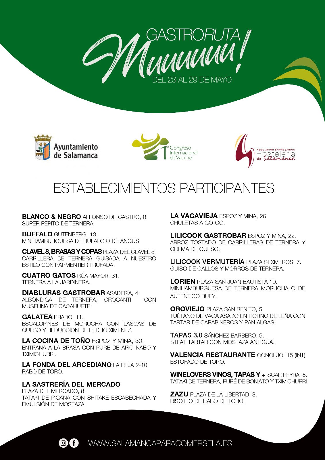 27/05/2022 GASTRORUTA 1º CONGRESO INTERNACIONAL DEL VACUNO SALAMANCA Estos días Salamanca está Muuuuu VacunoAquí tenéis las propuestas gastronómicas para apoyar al I Congreso Internacional del Vacuno en #Salamanca. No os lo perdáis #salamancaparacomersela @AsocHosteleriaSalamanca #congresointernacionalvacuno #CIV