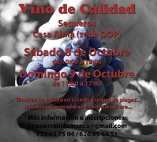 La VI Jornadas de Producción de Vino de Calidad tendrá lugar los próximos días 8 y 9 de Octubre (Sábado y Domingo)en Sequeros, en la Casa Alma, sede de la DOP Vino de Calidad de Sierra de Salamanca (Avda. Virgen del Robledo núm. 11)