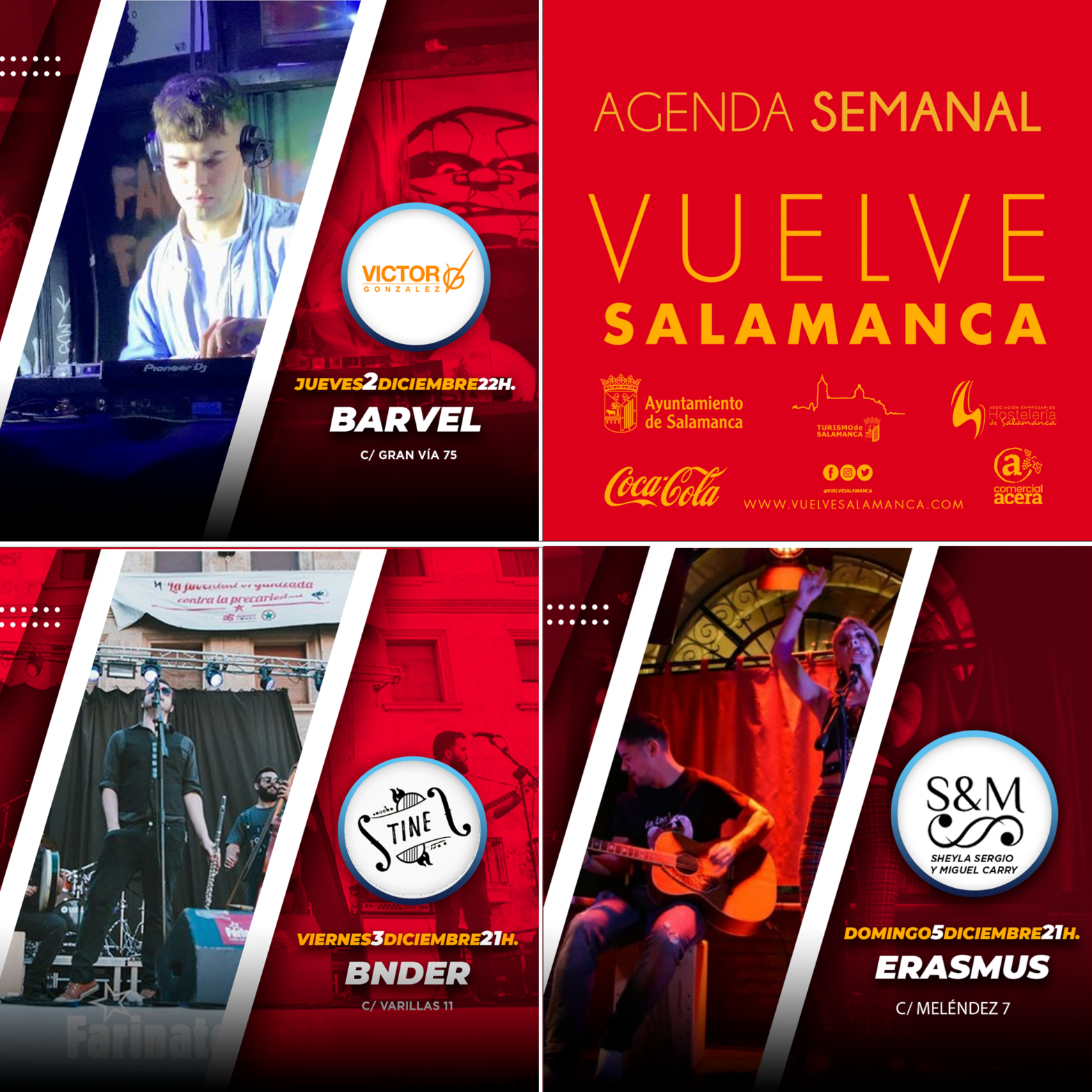 El Ayuntamiento de Salamanca, a través de la concejalía de Turismo, la Asociación de Empresarios de Hostelería, Coca Cola y Comercial Acera, impulsan en su cuarto fin de semana dos nuevos eventos dentro del ciclo de conciertos que, bajo la denominación ‘Vuelve Salamanca’, impulsa las actuaciones de música en vivo como un activo que fomente la recuperación del sector del ocio nocturno.